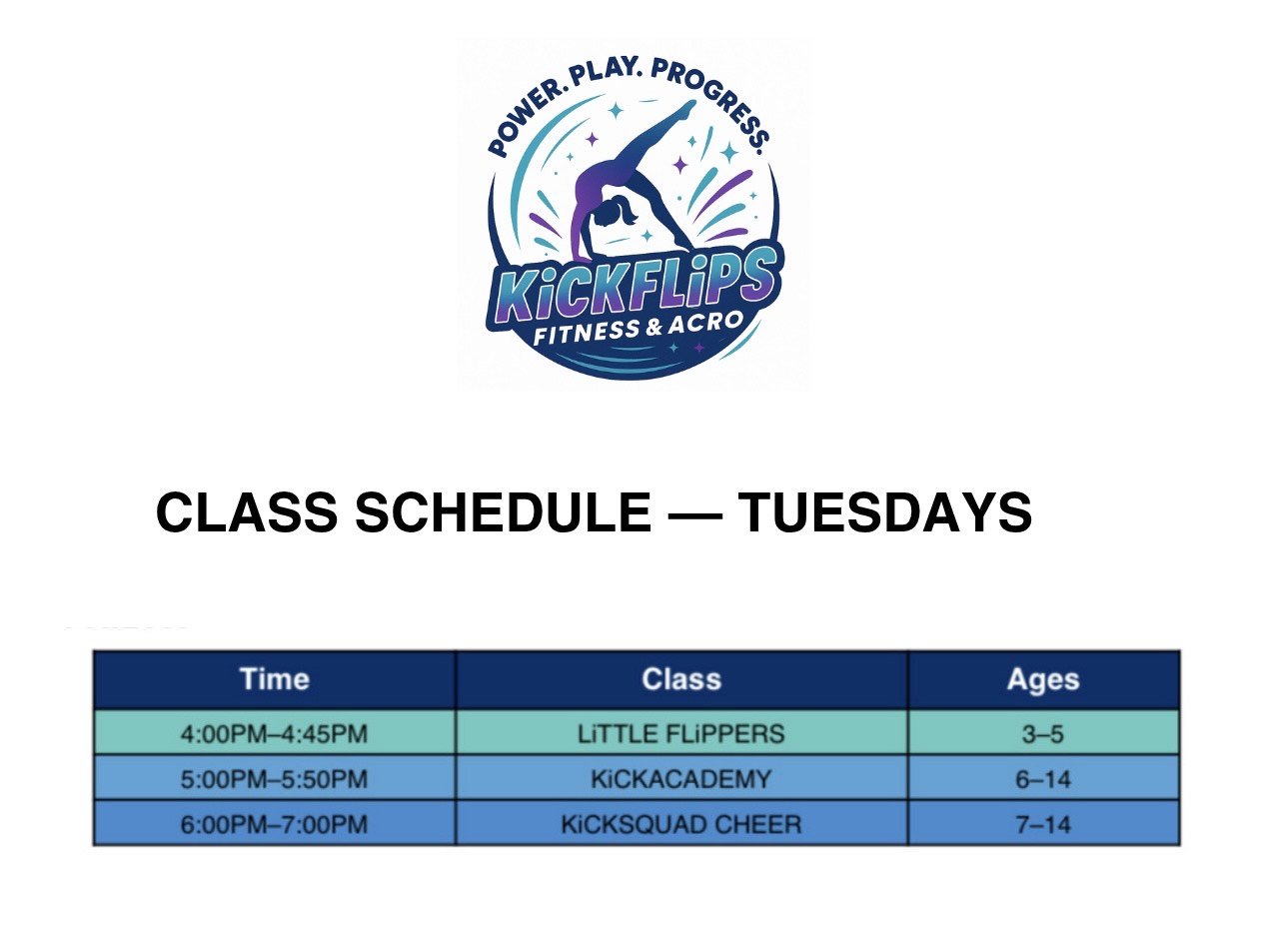 At KiCKFLiPS, every class is thoughtfully designed to build strength, confidence, and skills, step by step. While our current schedule is tailored for the busy back-to-school season, the full lineup below shows how our program supports long-term growth for athletes of all ages and levels.