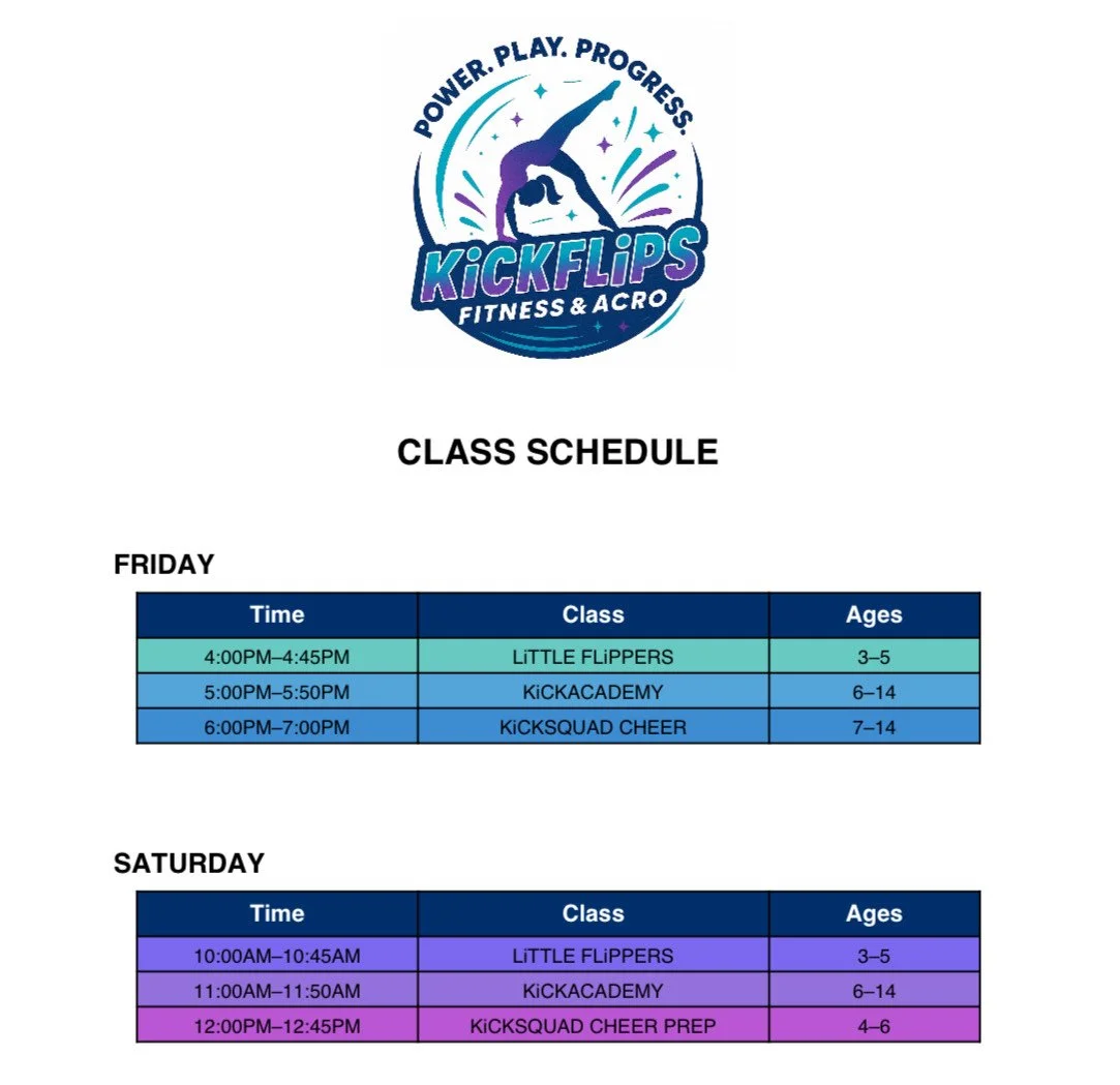 At KiCKFLiPS, every class is thoughtfully designed to build strength, confidence, and skills—step by step. While our current schedule is tailored for the busy back-to-school season, the full lineup below shows how our program supports long-term growth for athletes of all ages and levels.